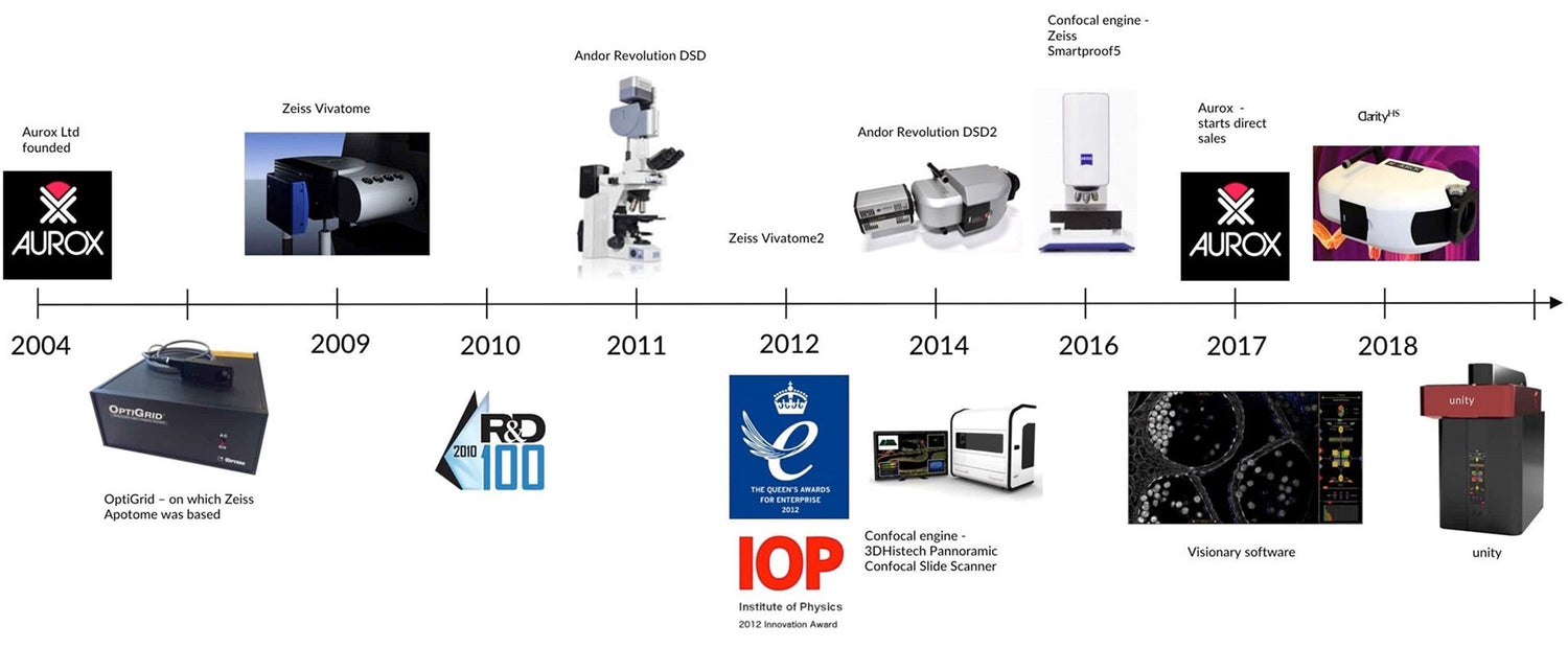Aurox was founded in 2004 by four renowned scientists who worked in the Scanning Optical Microscopy group at the University of Oxford, with over 100 years of confocal microscopy experience between them. Between 2004 and 2017 Aurox developed novel confocal imaging systems which were sold through their OEM partners servicing numerous marketplaces. From 2017 Aurox has focused mainly on the field of Life Science Research.